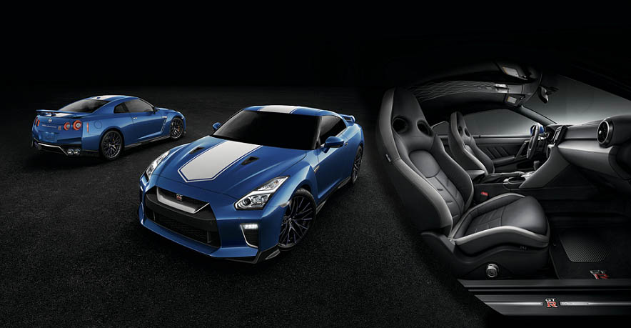 ستجمع النسخة الخاصة من السيارة بين ثلاث حقب زمنية وستتميز بمقصورة خارجية من لونين الهدف منهما تسليط الضوء على تصاميم GT-R التي اعتُمدت في سلسلة الجائزة الكبرى اليابانية، والتي صُممت GT-R الأصلية لتتميز فيها. ويعود طلاء Bayside (Wangan) الأزرق الذي أوقف استخدامه منذ طرازGT-R “R34” حيث تكمّله خطوط السباق البيضاء. وتحرص طبقات الطلاء الأربع المعالجة بالحرارة بصورة مزدوجة على إبراز اللون الأزرق النابض بالحياة والظلال اللافتة. وتشكّل التطعيمات الزرقاء على الإطارات جزءاً من اللمسات المتعددة التي أضيفت احتفالاً بهذه المحطة المهمة في مسيرة طراز GT-R. ويكمّل تصميم الذكرى الـ50 طلاء بلون اللؤلؤ الأبيض مع خطوط حمراء وطلاء فضي مع خطوط بيضاء.