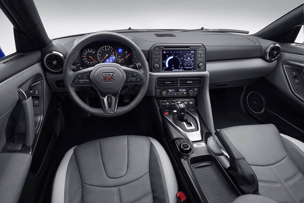 وتتسم المقصورة الداخلية في نسخة الذكرى الـ50 بلون رمادي مميز يمنحها طابعاً مترفاً يذكّر بسماء الليل (يتوفر اللون أيضاً في طرازات محددة أخرى من سيارة GT-R 2020). ومن بين مزايا النسخة الخاصة بالذكرى الـ50 عجلة قيادة ومقبض ناقل حركة فريد، ونقش خاص على المقاعد، وأقمشة علوية من نسيج ألكانتارا ذات قطب فريدة، وحاجب أمامي للشمس مغلّف بنسيج ألكانتارا وغيرها الكثير.