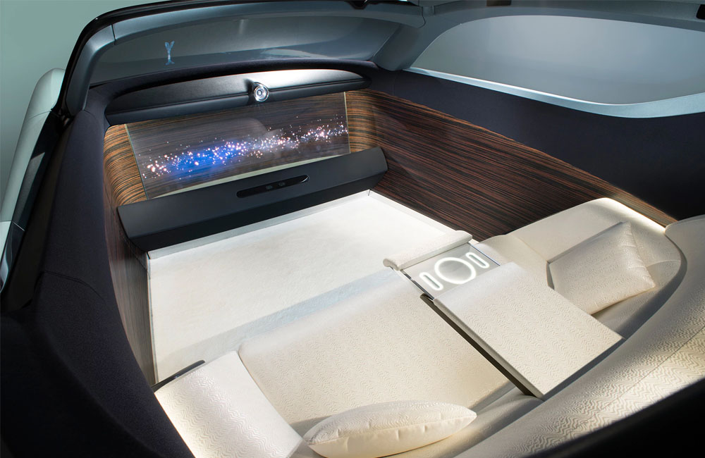 داخل هذه الرولز رويس مستقبلي بامتياز فهو قبل كل شيء لا يحتوي على مقود لا بل تعتمد وبشكل أساسي على مساعد صوتي اسمه "إليانور" كي يصار إلى تحريك السيارة.