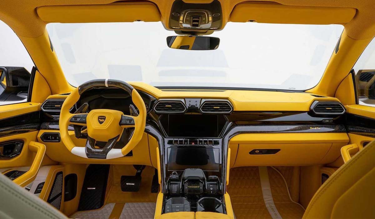 تبرز داخلية لامبورجيني اوروس المعدلة من مانسوري داخلية مميزة باللون الاصفر اللامع، كما اضيف الى جانب اللون الاصفر لمسات بيضاء على عجلة القيادة، وحصائر الارضية، والابواب.