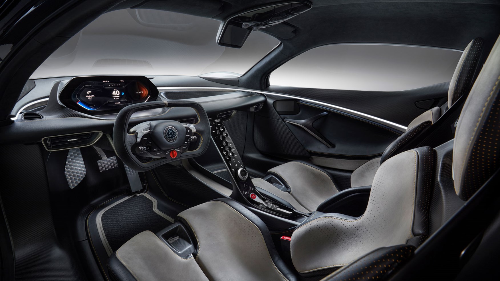 أما بالنسبة للمقصورة التي تأتي على شكة دمعة، فقد صممتها لوتس بعوارض من ألياف الكربونات تحمل كل شيء يحتاجه السائق ليكون في متناول يديه، وعلى الرغم من أنها مقصورة مستقبلية إلا أن لوتس ملتزمة بخفض الوزن، وتوجد عجلة قيادة ذات طراز F1 مسطحة القاع مع مجموعة من أوضاع القيادة المختلفة Eco وCity وTour وSport وTrack، كما توجد شاشات OLED جانبية على الأبواب تعرض ما تلتقطه الكاميرات المثبتة على جانبية السيارة، ومن المثير للاهتمام أنها لا تحتوي على شاشة لمسية، حيث ترغب لوتس أن يحافظ السائق على تركيزه طوال فترة القيادة.