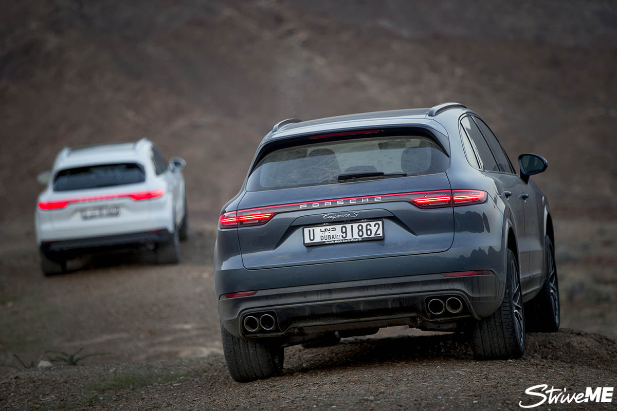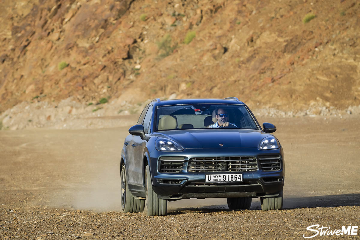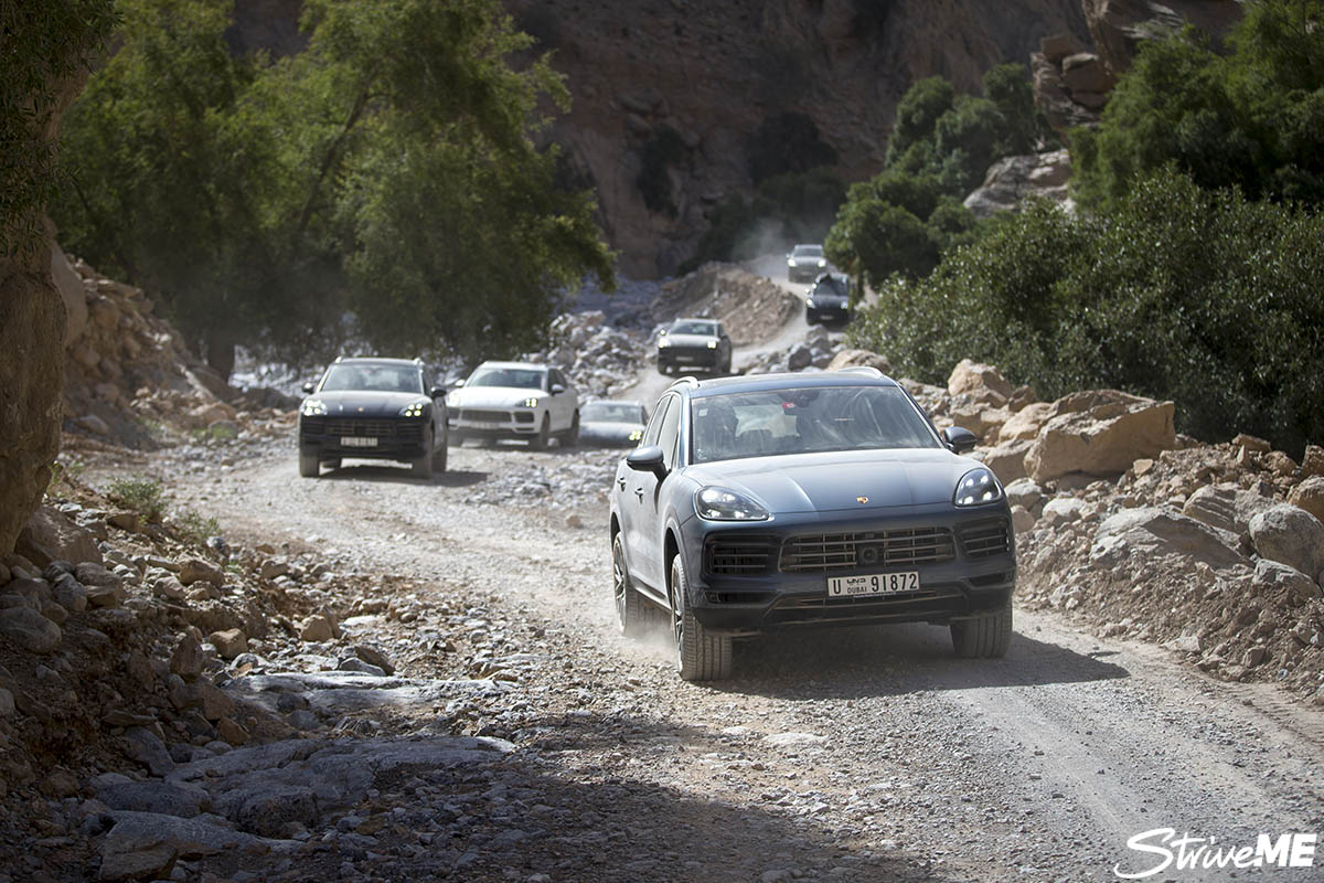انتهت رحلتنا على الطرقات المعبدة ودخلنا المسار الوعر في سلطنة عٌمان حيث كان لا بد من تغيير نمط القيادة، فانتقلنا من نمط القيادة العادية الى نمط الطرقات الوعرة حيث ايضا باتت قيادة "كايين" أسهل، كونها تتيح للسائق الاختيار من بين خمسة أنماط دفع وهيكل مُبرمجة مُسبقا وفقا للمسار. وكان اختيارنا لنمط الحصى والحجارة مناسباً لطبيعة الطرقات المتوقع اجتيازها واذ بنظام بورشه للتحكم بالدفع وبالتناغم مع التعليق الهوائي ثلاثي الحجرات، الذي ايضا يظهر لأول مرة على السيارات بعدما كانت بورشه السباقة في اعتماد نظام تعليق هوائي ذات حجرتين، يجتاز اي نوع من الصعوبات التي واجهناها خلال قيادتنا للـ"بورشه كايين" داخل الجبال الصخرية في السلطنة.
