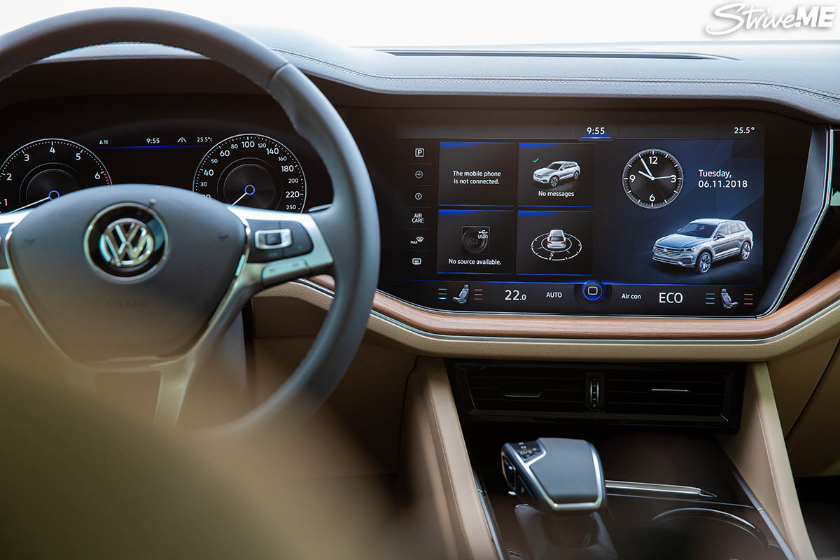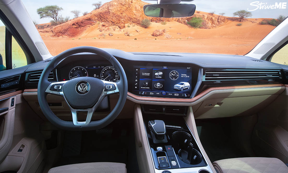 الانطباع الاول كان رائعا عند دخولنا مقصورة القيادة، فالمواد المستعملة من جلود وخشب وغيرها تعطي رونقا رائعا يعكس الرفاهية في هذه السيارة. لكن هذا لم يبهرنا بقدر التكنولوجيا المعتمدة في طوارق 2019 التي ستعجب السائقين المولعين بالتكنولوجيا والمهتمين بالأعمال.