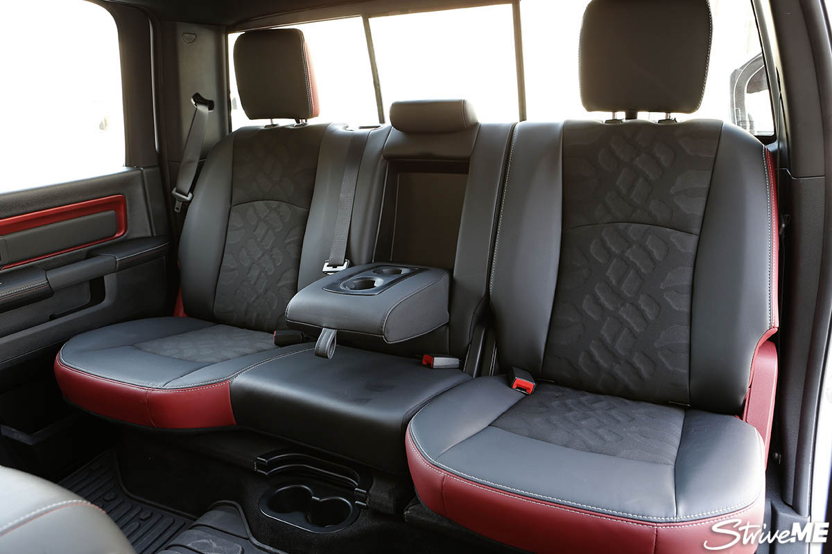 من ناحية اخرى، تتمتع رام ريبل بتجهيزات واماكن تخزين عديدة تضمن راحة الركاب، ومن المميزات التي لفتت انتباهنا في الداخل، امكانية طي المقاعد الخلفية وتحويلها الى سرير صغير ان اراد احد الركاب اخذ قسطاً من الراحة.