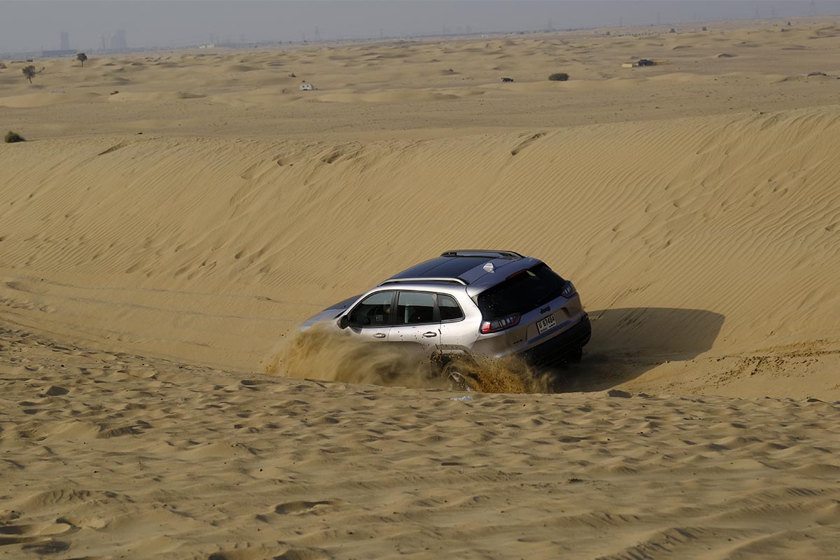 اما رنا فكانت تستغل هذا الوقت للقيام بمغامرة صغيرة في صحراء دبي مستفيدة من القدرات الميكانيكية لـ جيب شيروكي 2019 من محرك بنتاستار سعة 3.2 لتر الذي يولد قوة تبلغ 271 حصاناً و324 من عزم الدوران ليحقق مستوى سحب الأفضل ضمن فئته.