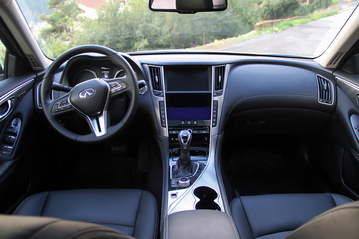 ما ان دخلنا مقصورة القيادة حتى تبين لنا بوضوح الاناقة والحداثة التي اعتمدها اليابانيون عند تصميم المقصورة الداخلية اذ أدخلوا على إنفينيتي كيو 50 مستوىً معززاً من الفن والجودة ان كان في التقنيات أو في المواد المستعملة وبشكل خاص المواد التي تشبه الجلد مع اطار من الدرزات المزدوجة لتقدم مساحة مريحة ومتصلة بالعالم.