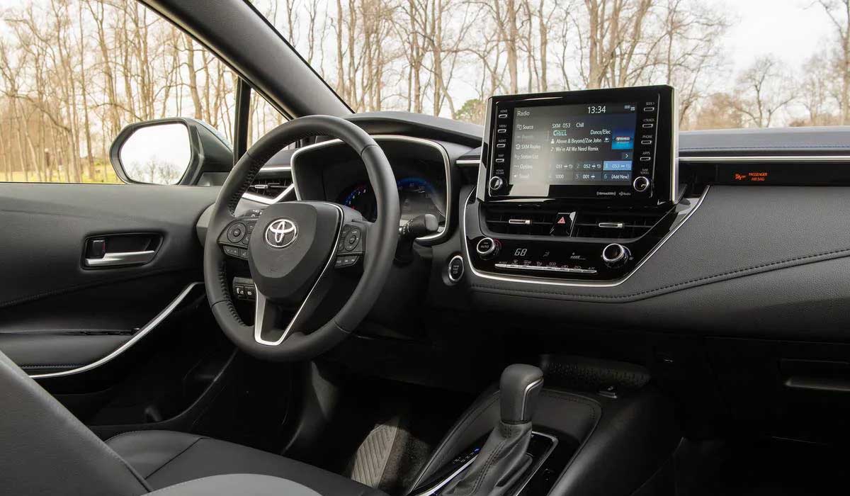 وفي الداخل، تأتي سيارات كورولا 2022 بمقصورة غير مألوفة مع الكثير من البلاستيك وتصميم بسيط ومريح. ومع ذلك، فإن هذه المواد البلاستيكية تبدو رائعة ونادرا ما يتم مقاطعتها بواسطة البلاستيك الصلب. توجد في سيارات كورولا 2022 شاشة اللمس المركزية أعلى لوحة العدادات، بينما تساعد شاشة TFT الصغيرة السائق. بشكل عام، تبدو هذه السيارات جذابة، ولا داعي للقلق عندما يتعلق الأمر بجودة البناء. المقاعد مريحة أيضا، والمقصورة فسيحة، على الرغم من أن الأفراد الأطول قد يكونون أكثر سعادة في المقدمة، كما تقدم بعض النسخ مقاعد مدفأة.