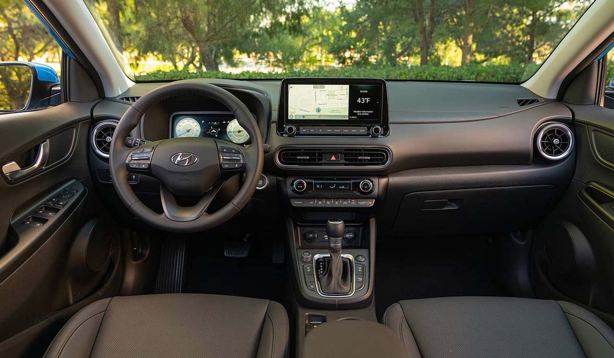 من الداخل، تأتي مقصورة السيارة كونا 2022، بتصميم داخلي حديث يحوي الكثير من التقنيات الحديثة ووسائل المساعدة، فضلًا عن المساحة الرحبة وعوامل الراحة المتاحة بالسيارة، وتقدم مستوى رفاهية وتجربة قيادة مميزة؛ بالإضافة إلى شاشة عدادات عالية الوضوح مقياس 10.25 انش، وشاشة لنظام المعلومات والترفيه مقاس 10.25 انش، مع نظام ملاحة، وخاصية العرض على الزجاج الأمامي، مع نظام صوت فاخر.
