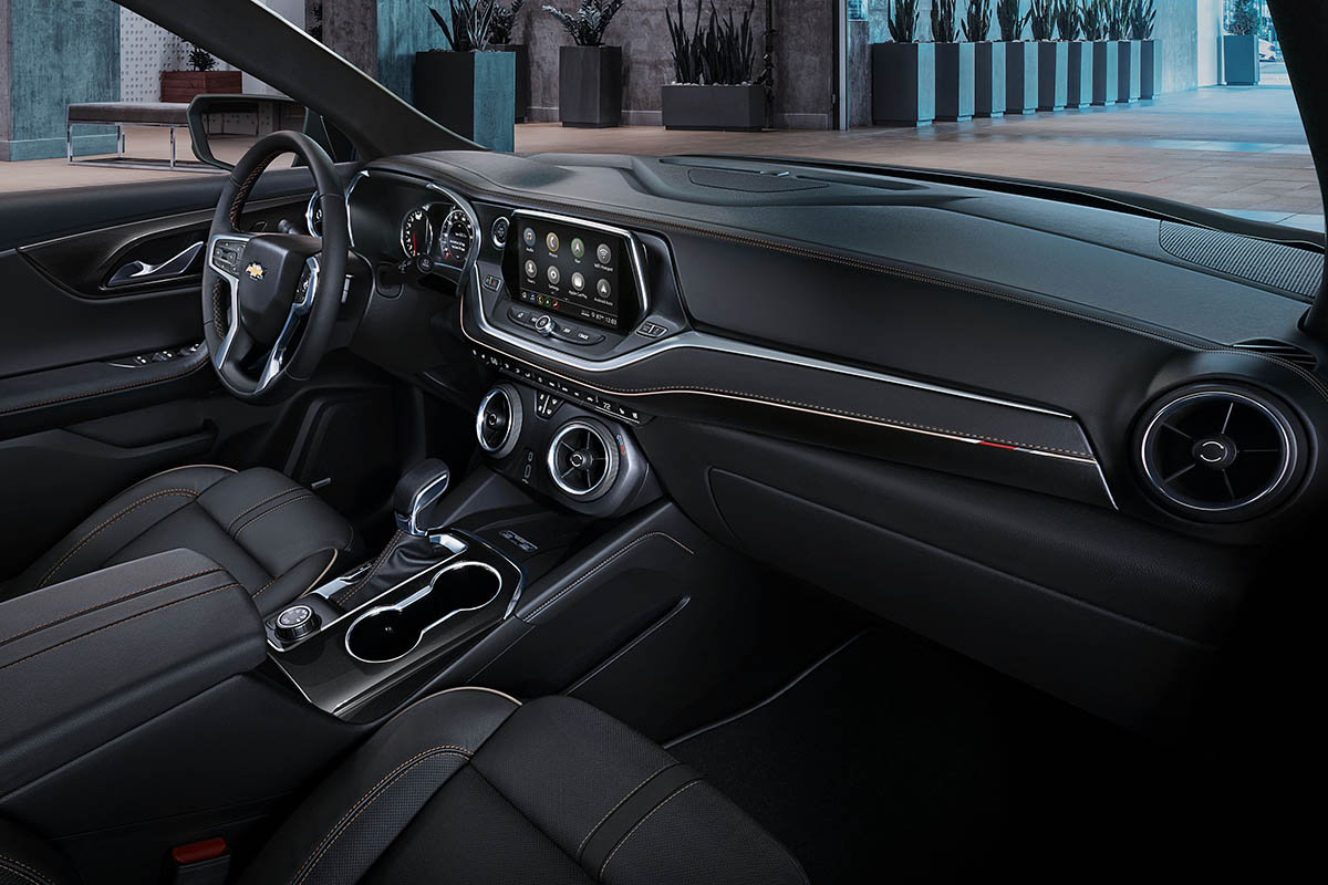 تأتي شفروليه بليزر قياسياً مع شاشة وسطية تعمل باللمس قياس 8.0 بوصة وتتميز بسهولة استخدام نظام الترفيه والمعلومات فيها، وتتوفر بمقاعد مريحة تتميز بإمكانية تعديل مقعد السائق كهربائياً بـ 8 اتجاهات، وتعديل كهربائي لمقعد السائق في منطقة أسفل الظهر، كما تتوفر مع عجلة قيادة مكسوة بالجلد مع أزرار التحكم بنظام الصوت، وعمود المقود قابل للتعديل اليدوي أفقياً وعمودياً.