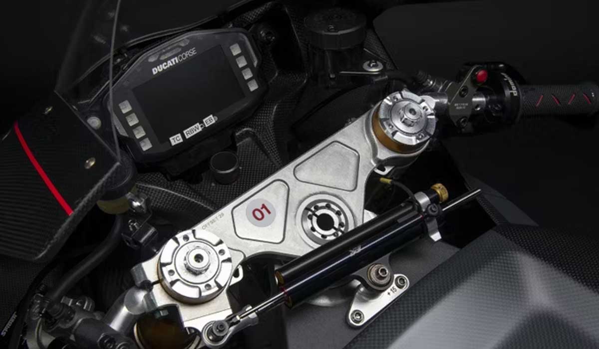 كما هو معتاد في السباقات، تستخدم دوكاتي أيضًا الكثير من ألياف الكربون، على سبيل المثال في الإطار الفرعي الخلفي. الإطار الأمامي و swingarm مصنوعان من الألومنيوم. بالنسبة لنظام التعليق، يتم استخدام العناصر القياسية من Öhlins، ولكن تم تصميم الفرامل خصيصًا بواسطة Brembo لتلبية متطلبات MotoE Ducati.