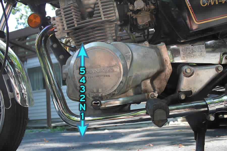 عندما تصل لسرعة كافية كي تقوم بالانتقال إلى جير أعلى، قم بتدوير مقبض التسارع للخلف بينما تقوم بسحب دواس الكلتش ثم ضع أصابع قدمك اليسرى أسفل دواسة ناقل الحركة وقم برفعها لأعلى نقطة ممكنة، حيث يمكنك الاستمرار بدفعها للأعلى كي تزيد من سرعتك.