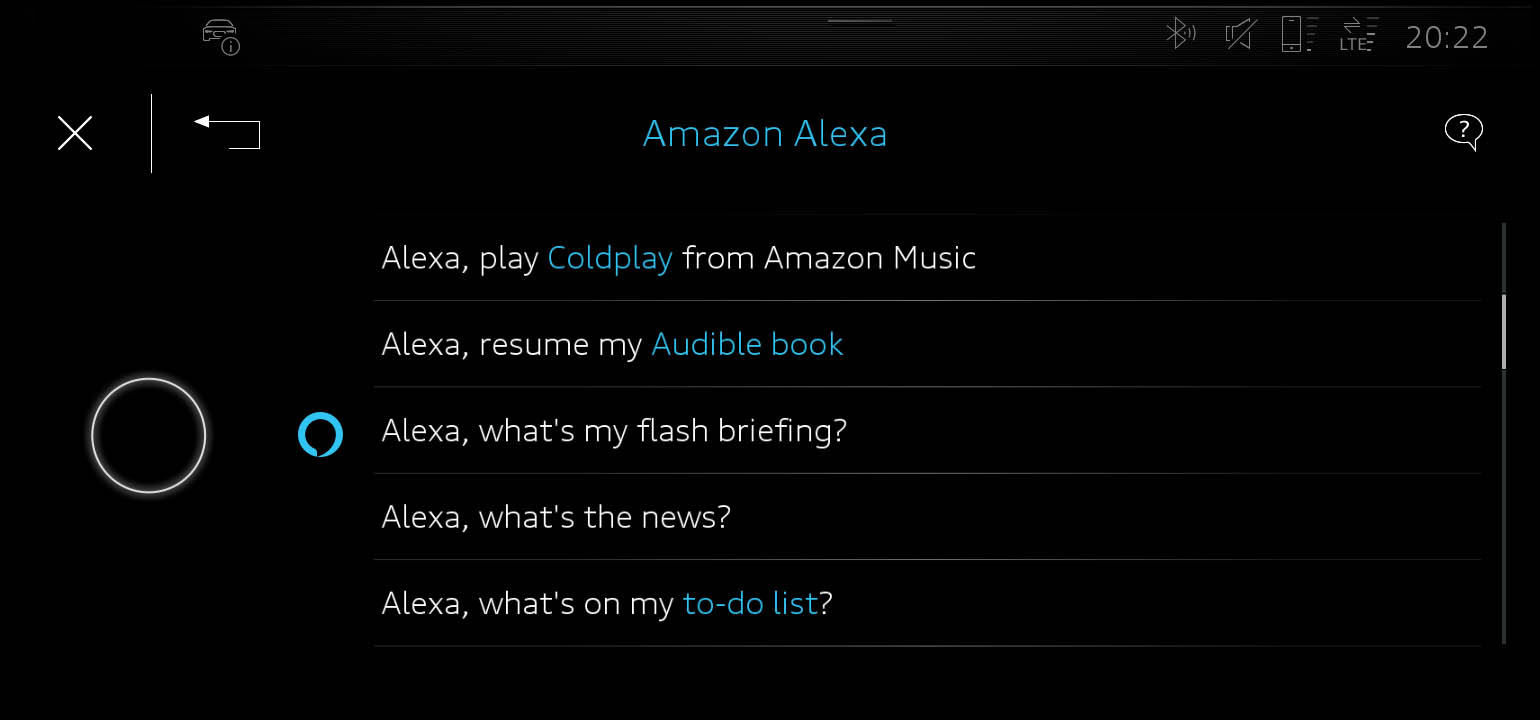 ونجحت أودي في دمج الخدمة الصوتية لموقع أمازون بشكل سلس في نظام MMI متعدد الوسائط لسيارة اودي e-tron الكهربائية. ولن يحتاج السائقون بذلك إلى تحميل أي تطبيق على هواتفهم الذكية أو حتى إقران هاتفهم بالسيارة للاستفادة من هذه الخدمة. كل ما عليهم فعله هو ربط السيارة بحسابهم في موقع أمازون ليتمكنوا حينها من تفعيل الخدمة الصوتية عبر نظام التحكم الصوتي المدمج. وبمجرد نطق كلمة "أليكسا"، تقوم شبكات الاتصالات المزودة بتقنية التطور طويل الأمد في نظام MMI متعدد الوسائط في سيارة أودي بالاتصال وإرسال الأسئلة إلى مخدّمات موقع أمازون لتُعرض الإجابات والمعلومات عبر نظام الصوت في السيارة.