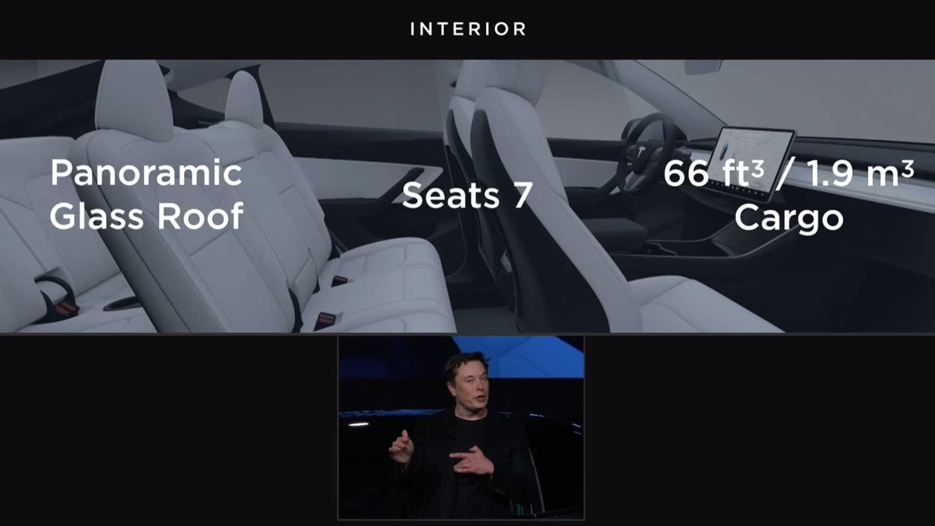 تتمتع مقصورة تسلا موديل واي بـ 5 مقاعد قياسياً، أما إذا أردت 7 مقاعد، فيمكنك دفع 3,000$ إضافية لقاءها، وعلى ناحية التصميم فإنها تتبع فلسفة البساطة التي رأيناها أيضاً بموديل 3، ومن بين مزاياها الرئيسية نجد سقف زجاجي بانورامي، شاشة لمسية أفقية مركزية قياس 15 بوصة، وإجمالاً تتخطى السعة التخزينية 1,800 لتر.