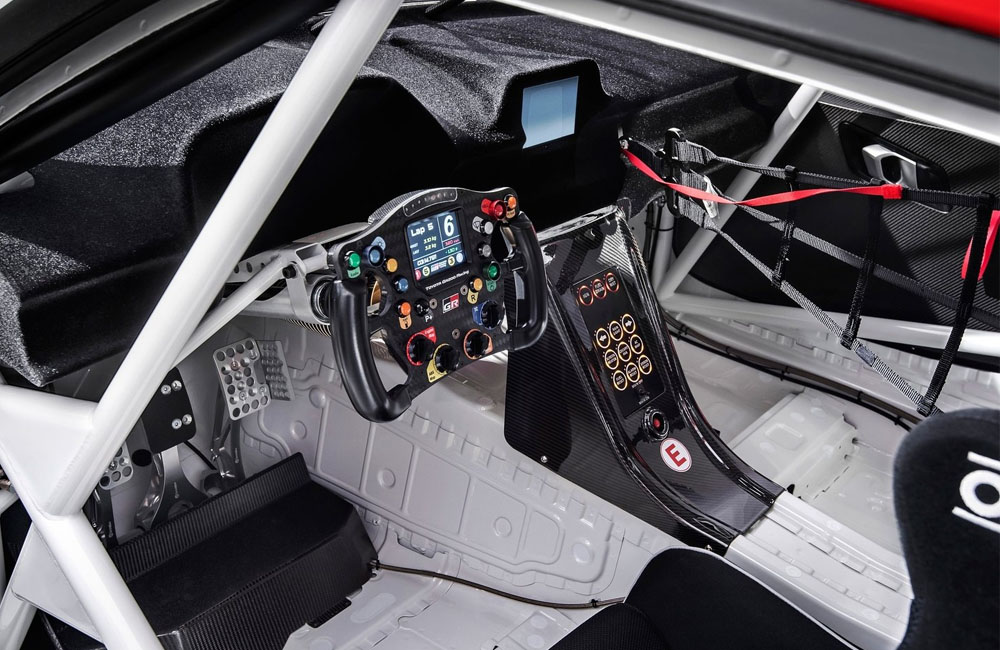 من الداخل السوبرا هذه هي سيارة سباقات حيث أنها تتمتع بعجلة قيادة تشبه تلك المتواجدة في سيارات الفورمولا 1، أي أنها تحتوي على أزرار عدة وعلى شاشة معلومات في وسطها هذا فضلاً عن أزرار في وسط الكونسول.