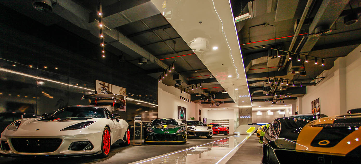 تبلغ مساحة صالة عرض لوتس الجديدة في دبي 5000 قدم مربع، تتسع لعرض 10 سيارات، وعند الافتتاح تم عرض مجموعة من سيارات لوتس المختارة بعناية، والتي تم انتقائها لتلائم تطلعات العملاء في دولة الامارات العربية المتحدة. وزينت سيارة Lotus Exige Cup 430 Type 25 المحدودة الإصدار العرض الإفتتاحي، فهي واحدة من 3 سيارات ستصل إلى إلى دول مجلس التعاون الخليجي من أصل 25 سيارة فقط مصنعة يدوياً. والسيارة الوحيدة من طراز 3-Eleven 430 الموجودة في منطقة الشرق الأوسط بلون لوتس الأسود والذهبي الشهير. بالإضافة إلى سيارة Evora GT430 المعروفة عالمياً كأسرع سيارة مخصصة للسير على الطرق العامة من لوتس.