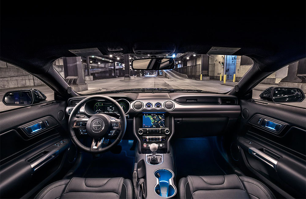 إلكترونياً توفر في الموستنج هذه نظام صوتي مجسم، نظام ملاحة عبر الأقمار الصناعية، نظام كشف البقعة العمياء، نظام تنبيه من مرور المشاة...