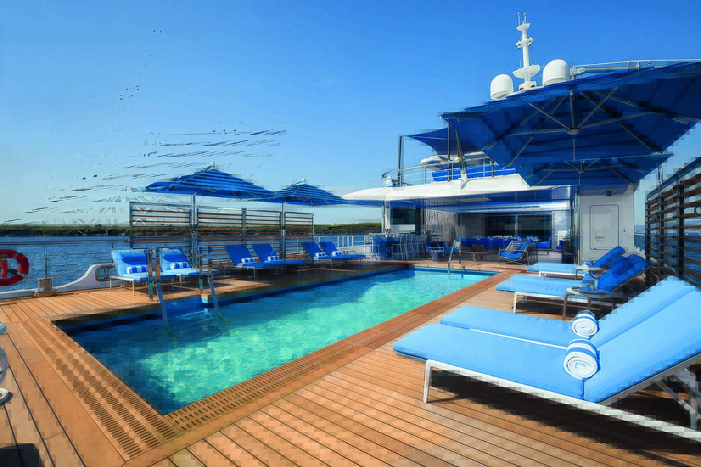 يقدم سوبريخت Benetti Seasense نادي شاطئ ضخم فريد من نوعه يضم مسبح كبير محاط بأرضيات خشبية للاسترخاء بأناقة وتميز تحت أشعة الشمس.