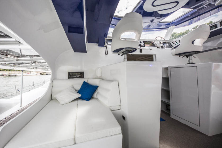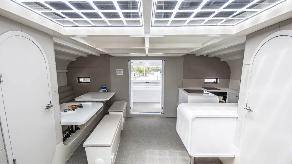 في الداخل، نجد أن مقصورة القارب يسيطر عليها اللون اﻷبيض تعبيراً عن نقائها مع أثاث مصمم ليكون خفيفاً بقدر اﻹمكان.