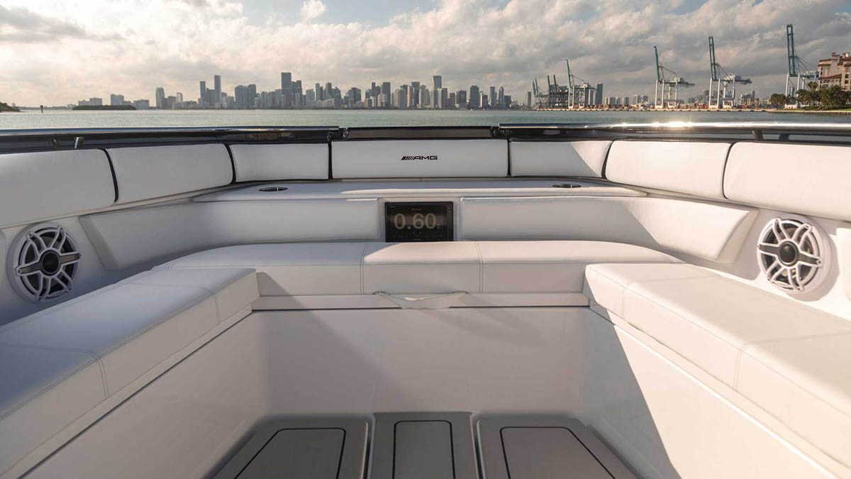 ركاب القارب السريع سيتمتعون بنظام صوتي فاخر يتميز بـ 29 مكبر صوت، مع وجود منطقة إعداد طعام خلفية تشمل شواية وحوض، في حين يوجد أسفل السطح أريكة وثلاجة وسرير ضخم مع حمام ودش استحمام.