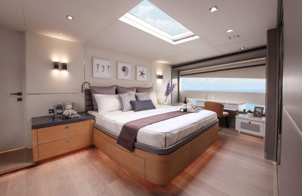 ما يميز يخت FD87 Skyline نوافذه الكبيرة الحجم التي تسمح بدخول الضوء الطبيعي إلى الداخل فيبرز بشكل رائع التصميم الذي اعتمد لبناء المقصورة.