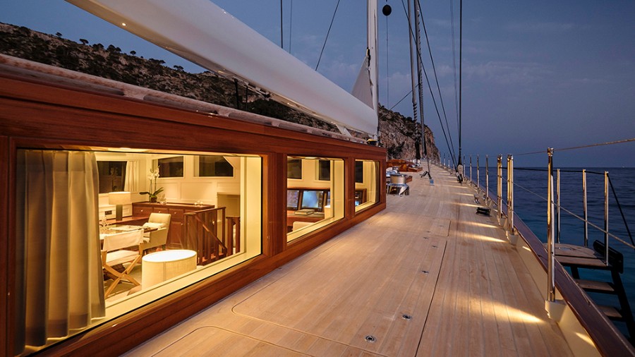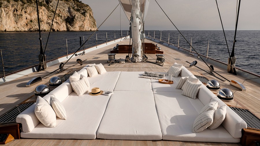 أكوارياس يمتلك على سطحه ميزة رئيسية أخرى، ألا وهي صالون كبير بأعلاه شمسية بأرائك وطاولات راقية للاستمتاع بالهواء الطلق والإطلالة على المحيط مع الأصدقاء.