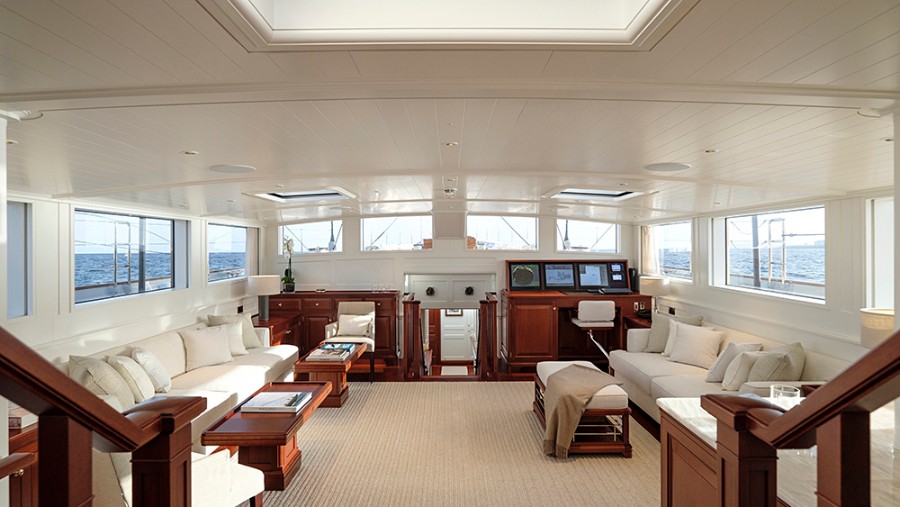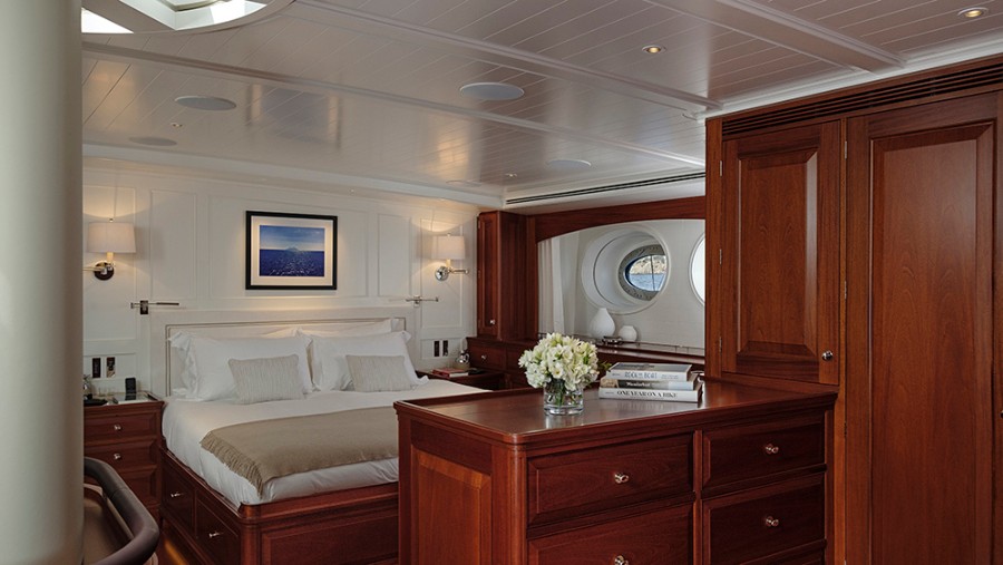 المقصورة مشبّعة بأثاث خشب الماهوجني وألواح مع جدار أبيض كي يعلّق المالك التحف الفنية وأياً كان ما يريد عليه، مع مفروشات تولّد هالة هادئة وعصرية بالوقت نفسه.