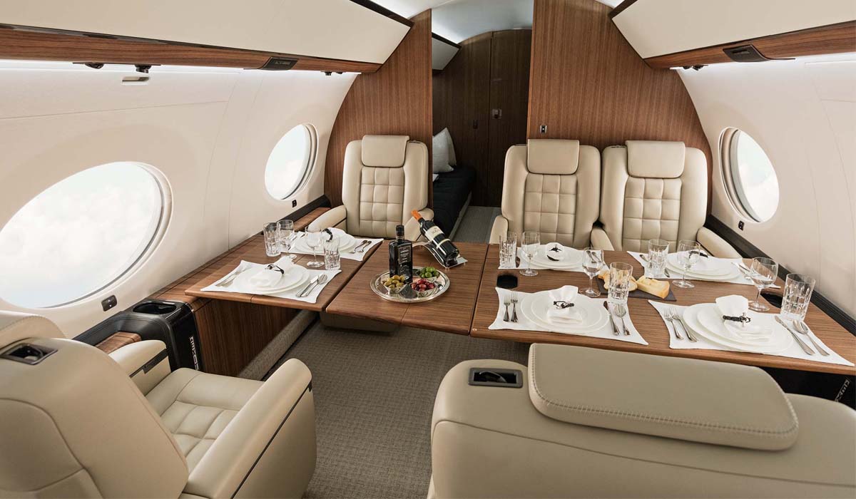 تتميز المقصورة الداخلية الفاخرة للطائرة الخاصة بتصميم مرن ويمكن تخصيصها بجلد فاخر وأعمال حجرية وأكواب مصنوعة يدويا وتركيبات خشبية عالية الجودة. تشمل المساحات قاعات خاصة ومناطق مؤتمرات وغرف نوم بحمامات داخلية وصالات متطورة وأطباق مجهزة تجهيزا كاملا. يوجد 16 نافذة بيضاوية كبيرة لزيادة الضوء الطبيعي وتوفير مناظر خلابة. يسمح نظام إدارة المقصورة المتطور Gulfstream للركاب بالتحكم في الإضاءة ودرجة الحرارة وظلال النوافذ وأجهزة الترفيه عبر تطبيق الهاتف الذكي.