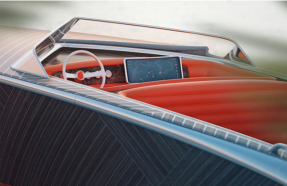 داخل القارب أتى بلون برتقالي غامق ويمكن أن يستوعب من 6 إلى 8 أشخاص وقد تواجد فيه لوحة تعمل باللمس من نوع أوليد في تستخدم لنظام الملاحة. هذا وأتت المقاعد جلدية وبرتقالية أيضاً مع كابينتين منفصليتن، بحيث أن الأولى تم تخصيصها للسائق والراكب الأمامي في حين أتت الثانية كبيرة الحجم للاستمتاع بمياه البحر قدر الامكان.