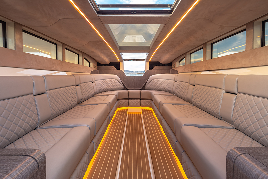 هذا ويتكون يخت اوندا من 3 مناطق تتضمن سطح اليخت المفتوح في المقدمة والذي يقدم رؤية شاملة، اضافة الى مقصورة كبيرة مغطاة بالوسط، ما يضمن للركاب أقصى مستويات الراحة والرفاهية أثناء الجلوس بالداخل مع ديكور بسيط راقي ولكن فاخر بالوقت ذاته عبر الجلود الفخمة والتطريزات التي ستعجب كافة الضيوف الذي يمكن أن يصل عددهم إلى 10.