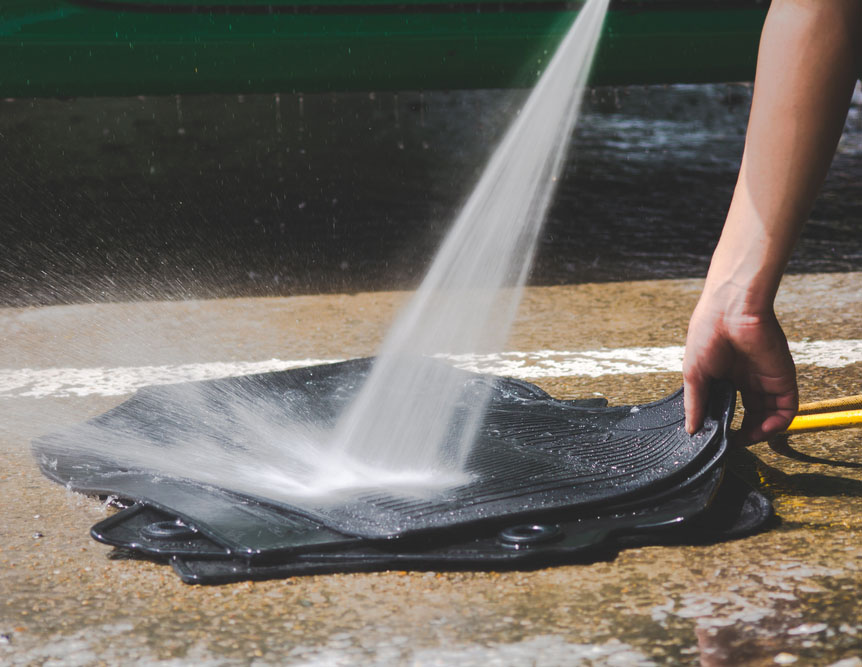 تستقبل دواسات الأرضيات الكثير من الأتربة والطين التي تحملها أحذيتنا لداخل السيارة، ولهذا تكون الطريقة المثلى لتنظيفها هي رشها بمزيل بقع السجاد ووضعها بالمغسلة.