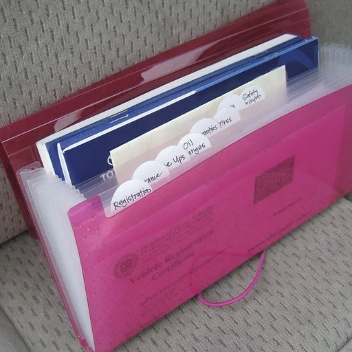 قومي بإحضار منظم ورق صغير من أي مكتبة، وضعي به كافة الأوراق الهامة المتبعثرة عادة داخل صندوق القفازات.