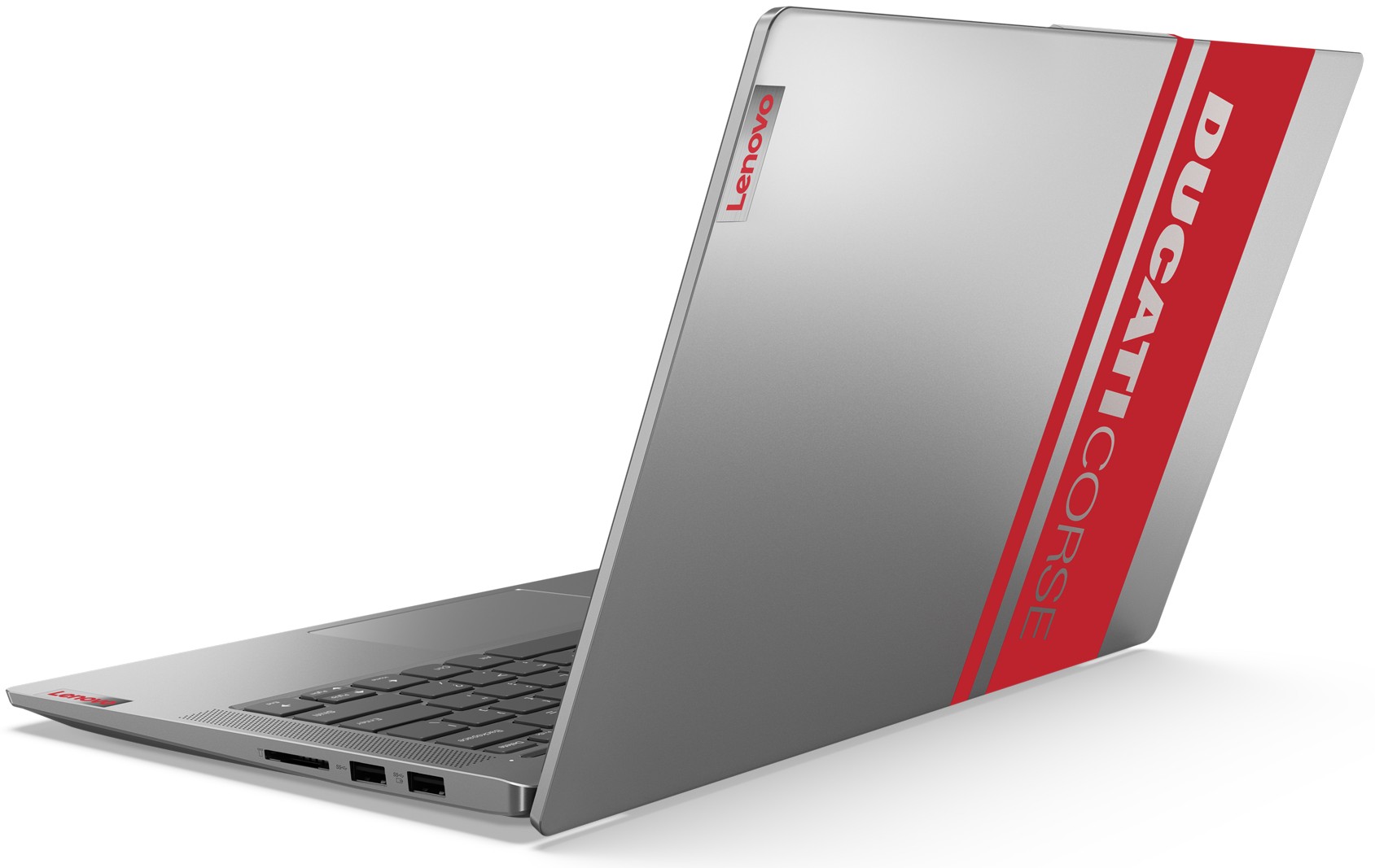 يحمل اللابتوب شرائط سباقات دوكاتي الحمراء الأيقونية مع تصميم لينوفو الفريد، وهو مصمم خصيصاً لعشاق دوكاتي، ويظهر ذلك من خلال كتابة اسم دوكاتي بخط واضح عليه وامتداد خطوط السباق الحمراء إلى الأسفل مع منافذ تهوية على شكل بيت النحل المستوحى من تصميمات دوكاتي.