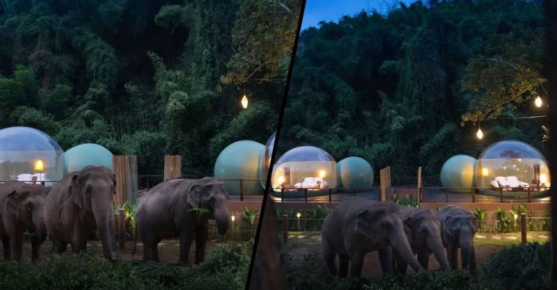 والملفت في الموضوع أن هذه الفيلة التي تتجول بجانب الفقاعات تم إنقاذها من شوارع المدينة التايلندية ويبلغ عددها 60 تقريباً ، ووضعت في هذه المنطقة لتنعم بالحرية والسلام.