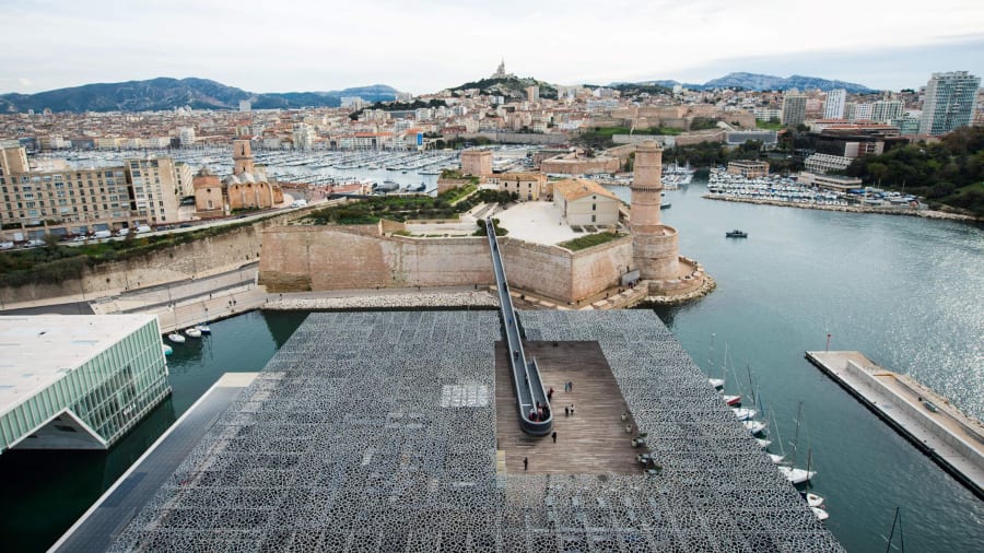 تقدم هذه اللقطة المأخوذة من الأعلى منظرًا رائعًا لمتحف الحضارات الأوروبية في مرسيليا فرنسا، والذي تم افتتاحه في عام 2013.