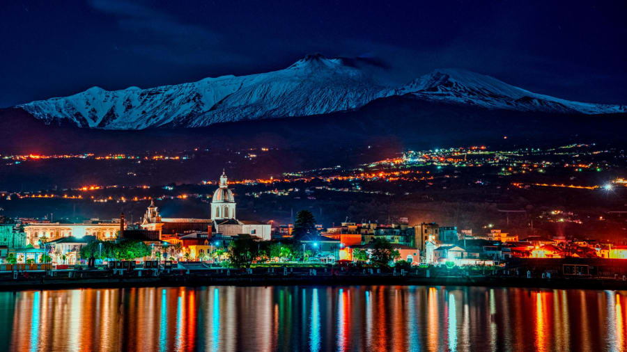 لن تجد أروع من رؤية ذروة البركان المليئة بالثلوج في جبل إتنا والتي تظهر من ميناء ريبوستو في كاتانيا ايطاليا، صقلية.