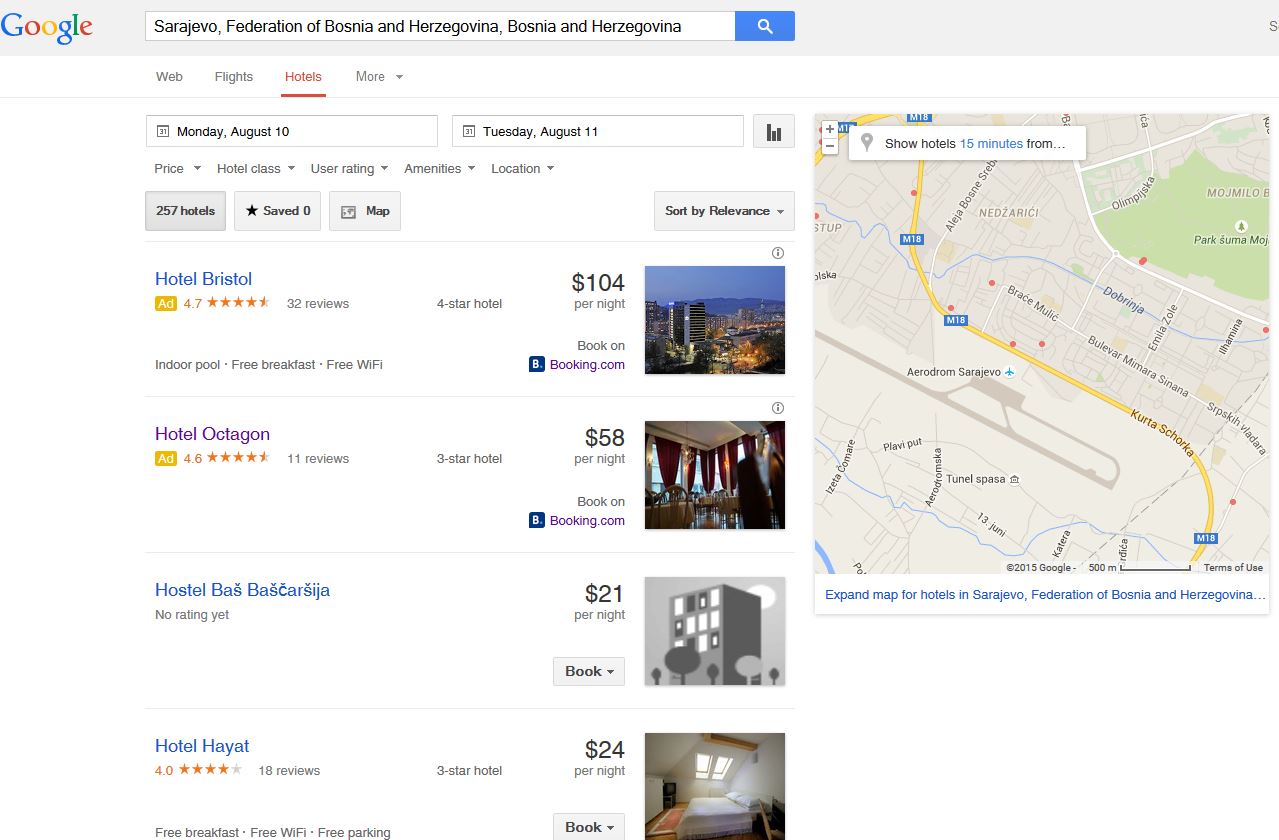 وحين نتحدث عن محرك بحث يسهل عملية حجز فنادق، لا يدري الكثيرون أن أكبر محرك بحث على الإنترنت لديه خدمة مخصصة لحجز الفنادق، قم بكتابة "Hotels in" متبوعة بالمكان الذي تبحث فيه وستجد جوجل يطلب منك تاريخ سفرك ويمدك بقائمة للفنادق الممكنة في هذا الموقع مزودة بخيارات منها قائمة الأفضل وقائمة الأكثر اقتصادية وقائمة الأفضل من وجهة نظر النزلاء.