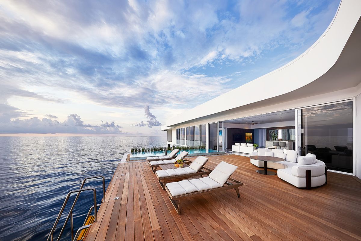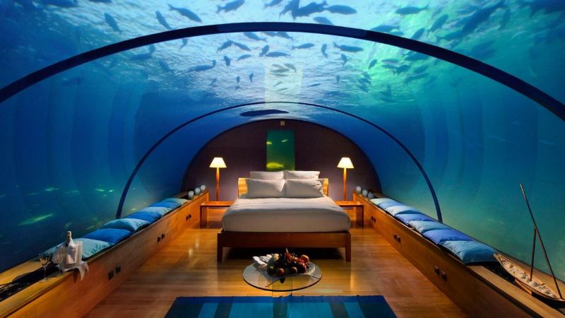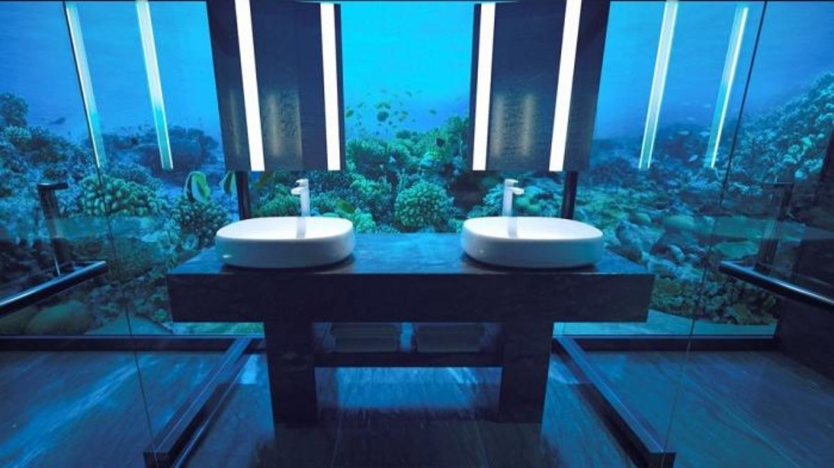 وتأتي الغرفة الرئيسية في الجزء المغمور تحت المياه على هيئة فراش ملكي، وتقدم لك رؤية بزاوية 180 درجة للبحر، فهل تتخيل المشهد؟! تخيل مثلا أنك تأخذ حماماً وسط كل هذا اللون الأزرق الرائع وألوان الشعاب المرجانية والأسماك المذهلة!