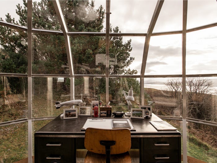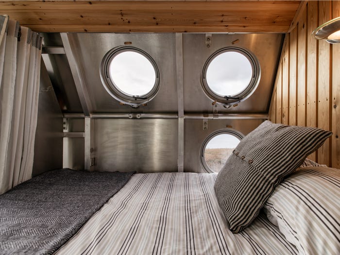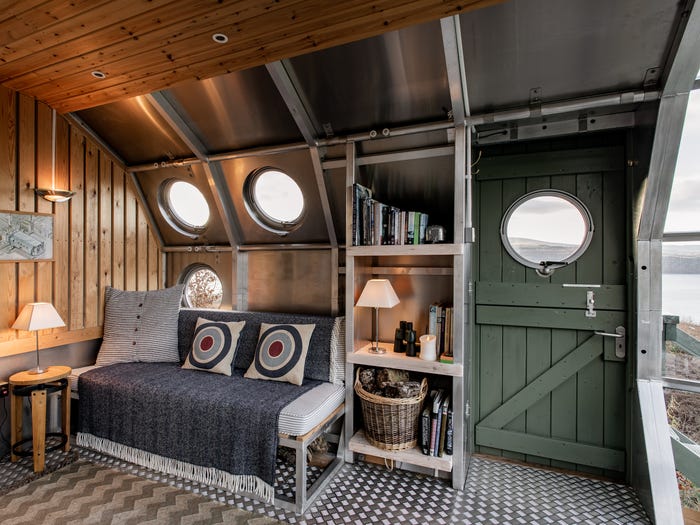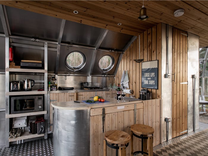 يحتوي المنطاد على نوافذ دائرية تمكن الضيوف من رؤية المساحات الخضراء المحيطة من خلال عدسة فريدة من نوعها. يحتوي المنزل أيضًا على ميكروويف وآلة صنع القهوة ، فضلاً عن مساحة مناسبة لتناول الطعام.
