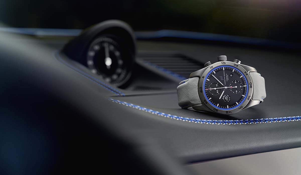 تم طلاء الحلقة الملونة على الميناء باللون الأزرق المعدني Sally Blue Metallic، كتباين مناسب مع التيتانيوم الطبيعي للساعة وتطابق مثالي للسيارة. يؤكد الحزام الجلدي بلون الطباشير مع درزات زخرفية باللون الأزرق السريع على التصميم الرياضي للعنصر الفريد من نوعه المستوحى من السيارات، وتحديدا بورشه 911 سالي سبيشال.