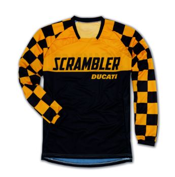 صممت هذه القطعة لمحبي قيادة طرازات سكرامبلر، يمكنك ارتداءها مع سترة واقية قبل القيام بمغامرة لا تنسى، يحمل الذراع تصميم رقعة شطرنج بالأبيض والأصفر وتمت كتابة سكرامبلر على الصدر للتأكيد على روح الإثارة.