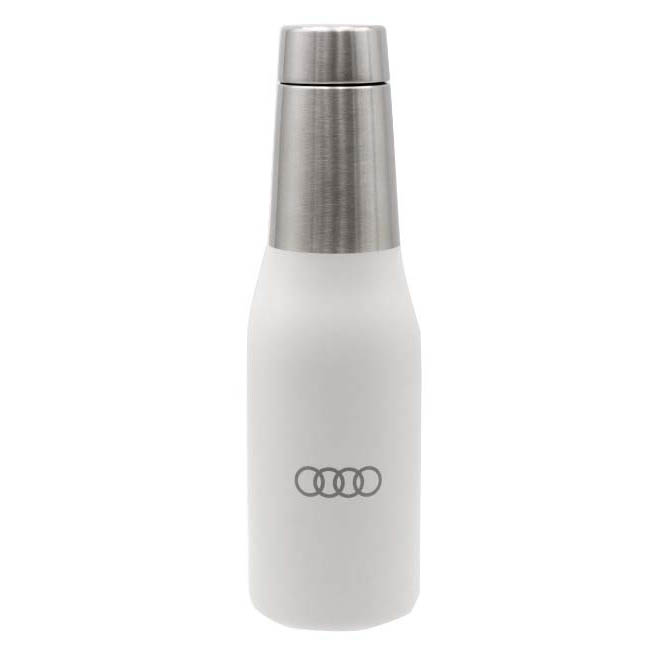 وتقدم لك اودي قارورة مياه مميزة، باللون الأبيض، والتي تحمل شعار الشركة باللون الرمادي للمسة من الأناقة، والتي تحافظ على برودة المياه لـ24 ساعة.