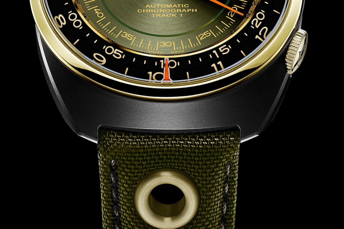 توجد الساعات والدقائق على هامش قرص الساعة، ويعرض الجزء المركزي من الساعة الذي يأتي باللون الأخضر الكاكي وظيفة الكرونوغراف، وبالمناسبة هذا اللون هو اختيار المصمم Marco Borraccino فهو اللون المفضل لديه، بالإضافة إلى تعزيز التفاصيل الذهبية الخاصة بالساعة، وتوجد أزرار التشغيل والإيقاف على جانبي العلبة لتسهيل تشغيل الكرونوغراف.