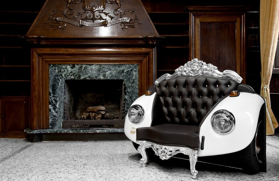 صممت ZAC Glamour Design هذا الكرسي من قطع أصلية لسيارة فولكس فاجن بيتل 1968، صنع الكرسي من مقدمة البيتل مع غطاء جلدي مضافا له كريستالات شواروفسكي لتشعر كما لو كان الكرسي عرض ملكي. يعطي اللونين الأبيض والأسود شعورا بالاحترافية مع الرونق الساحر والأناقة الفخمة للكريستال الامع.