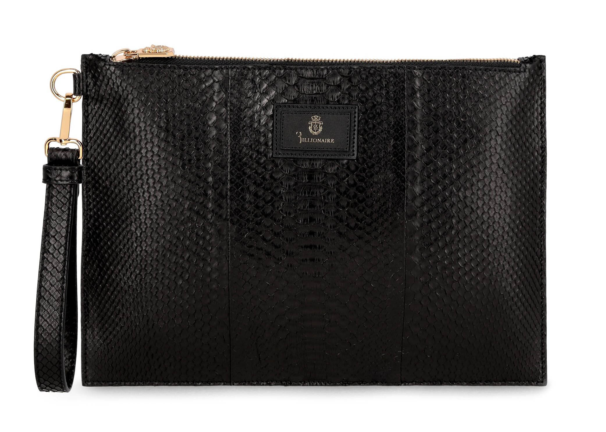 حقيبة Billionaire Pouch صغيرة سوداء، دخل اليها اللون الذهبي بانسيابية، وتحمل ذخرفات جلدية لتضمن الاناقة المطلقة.