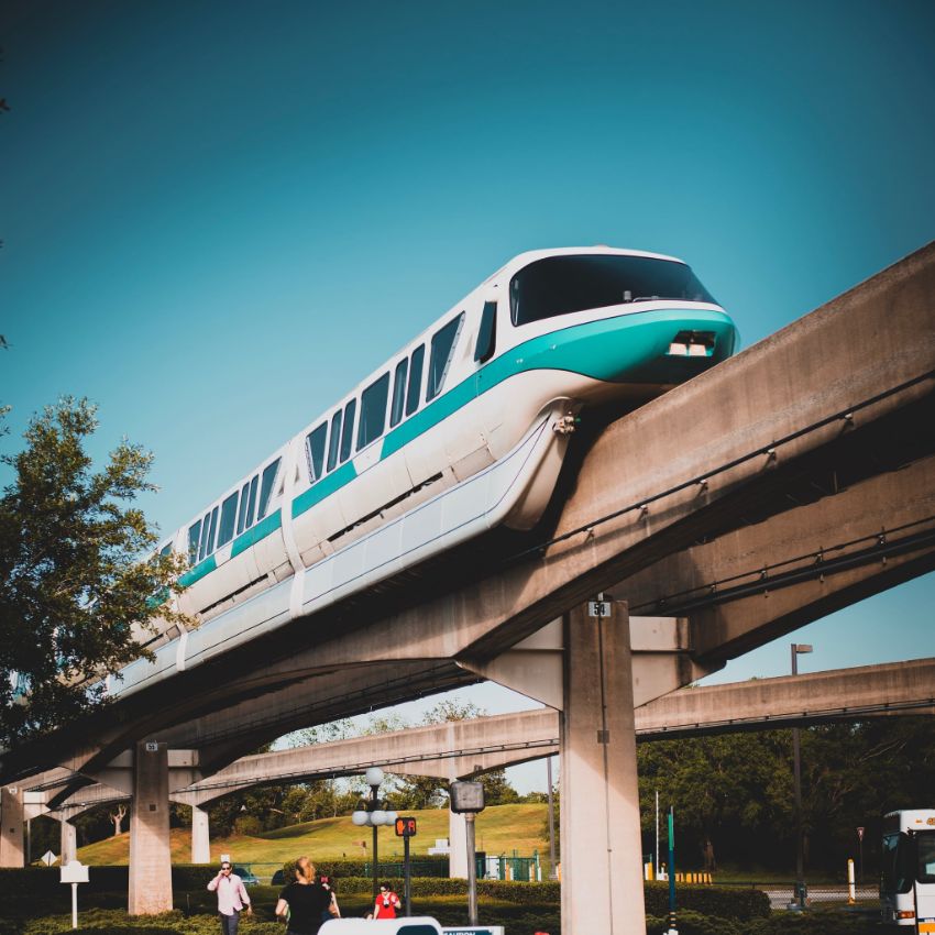 1- مونوريل هو قطار نقل جماعي يسير على سكة واحدة ويتواجد فوق الكباري الخرسانية المعلقة.