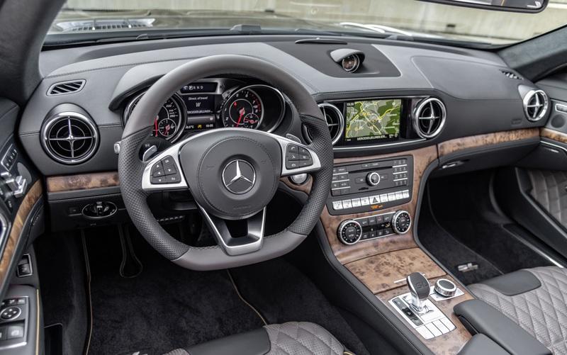 أمّا الجلد اللؤلؤي البني توندرا بسطحه اللامع فيضفي على المقصورة أجواءً من الفخامة وتحيط بعجلة القيادة الرياضية متعددة الوظائف اللمسة ذاتها. فقد صُمّم الجزء العلوي والسفلي من الإطار المعدني لعجلة القيادة من الجلد اللؤلؤي البني توندرا. وتمتاز منطقة المقبض في عجلة القيادة بسهولة التحكم بها بفضل جلد النابا الأسود. تتفوق تجهيزات SL القياسية على ذاتها في طراز Grand Edition.