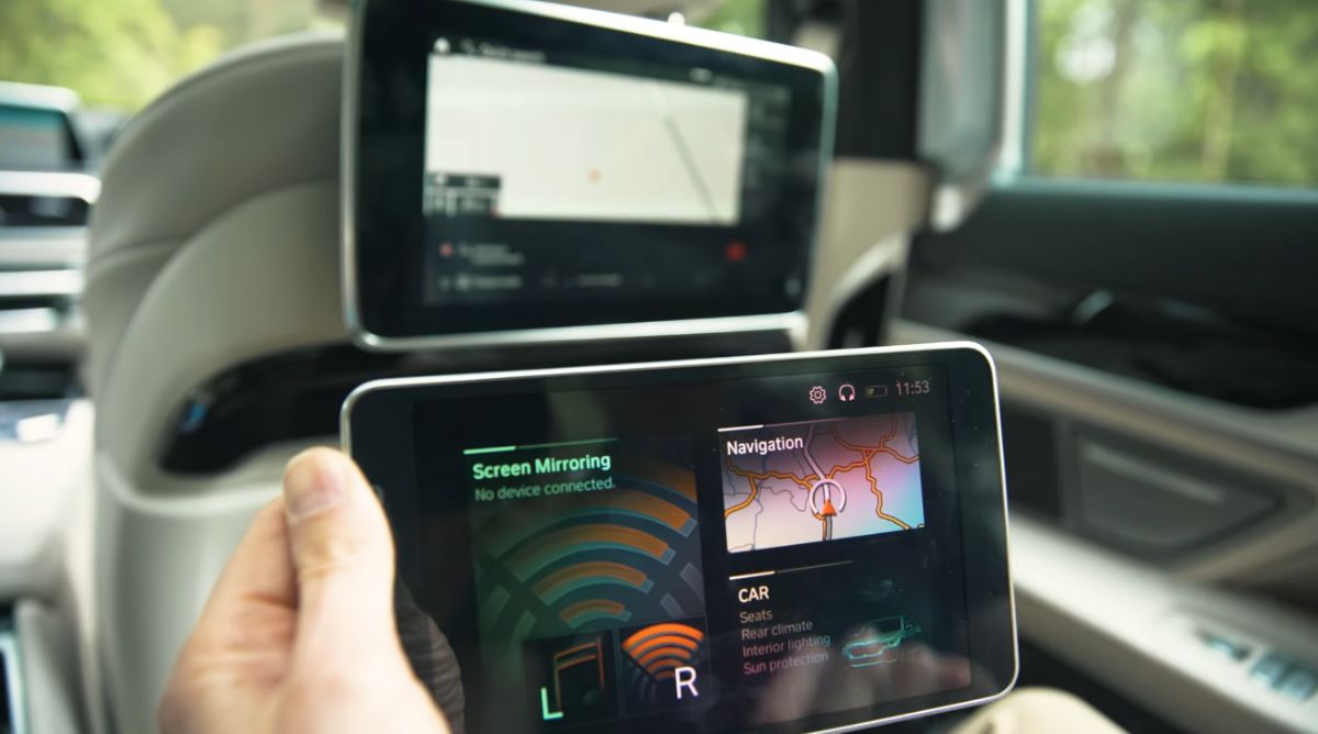 عند الجلوس في الخلف، ستجد في داخل الكونسول الوسطي شاشة تابلت محمولة يمكنك سحبها من مكانها للتحكم في أنظمة مختلفة تشمل الملاحة، والإضاءة الداخلية، والمكيف ودرجة الحرارة، وأنظمة التدليك المختلفة، وحتى رفع أو إنزال كافة النوافذ مع خيار منع دخول أشعة الشمس من فتحة السقف مع رفع ستائر النوافذ الكهربائية!