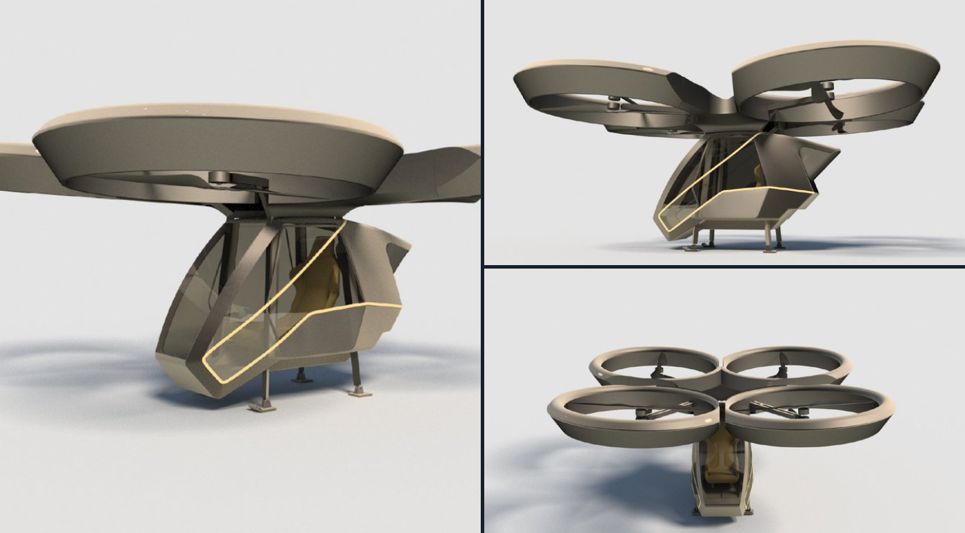 تعمل هذه المركبة على الطيران من خلال استخدام 4 مراوح عملاقة مثبتة أعلى مقصورة ركاب صغيرة بداخلها مقعد واحد محاط بالزجاج، من دون وجود أي شكل من أشكال التحكم أمام السائق، مما قد يعني أن المركبة مصممة كي تعمل بشكل ذاتي القيادة.