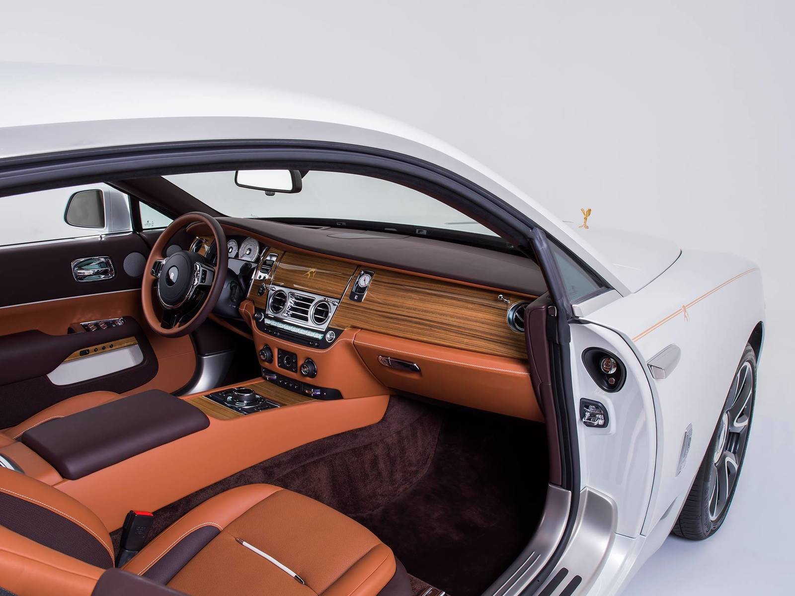 مع الانتقال للداخلية نجد أن اللون البني المائل للبرتقالي يغطي الداخلية عبر جلد ألكانتارا ولوحة قيادة خشبية، مع وجود لوح تصميم خلفي صغير يشير إلى الأمواج الرملية المعروفة في الصحراء العربية، حيث نجد أن الداخلية بالكامل تماثل الصحراء، موطن الصقر الطبيعي، مع وجود سقف الضوء السماوي الشهير من رولز رويس (Starlight Headliner) داخل رايث، وهو ما يعمل على مماثلة ضوء النجوم الليلي في الصحراء.