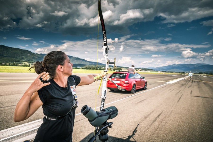 تم ذلك على يد مدرب فنون الدفاع عن النفس، ماركوس هاس، حيث استطاع إمساك سهم طائر أُطلق بواسطة الرامية الأولمبية النمساوية، لورانس بالدوفا.